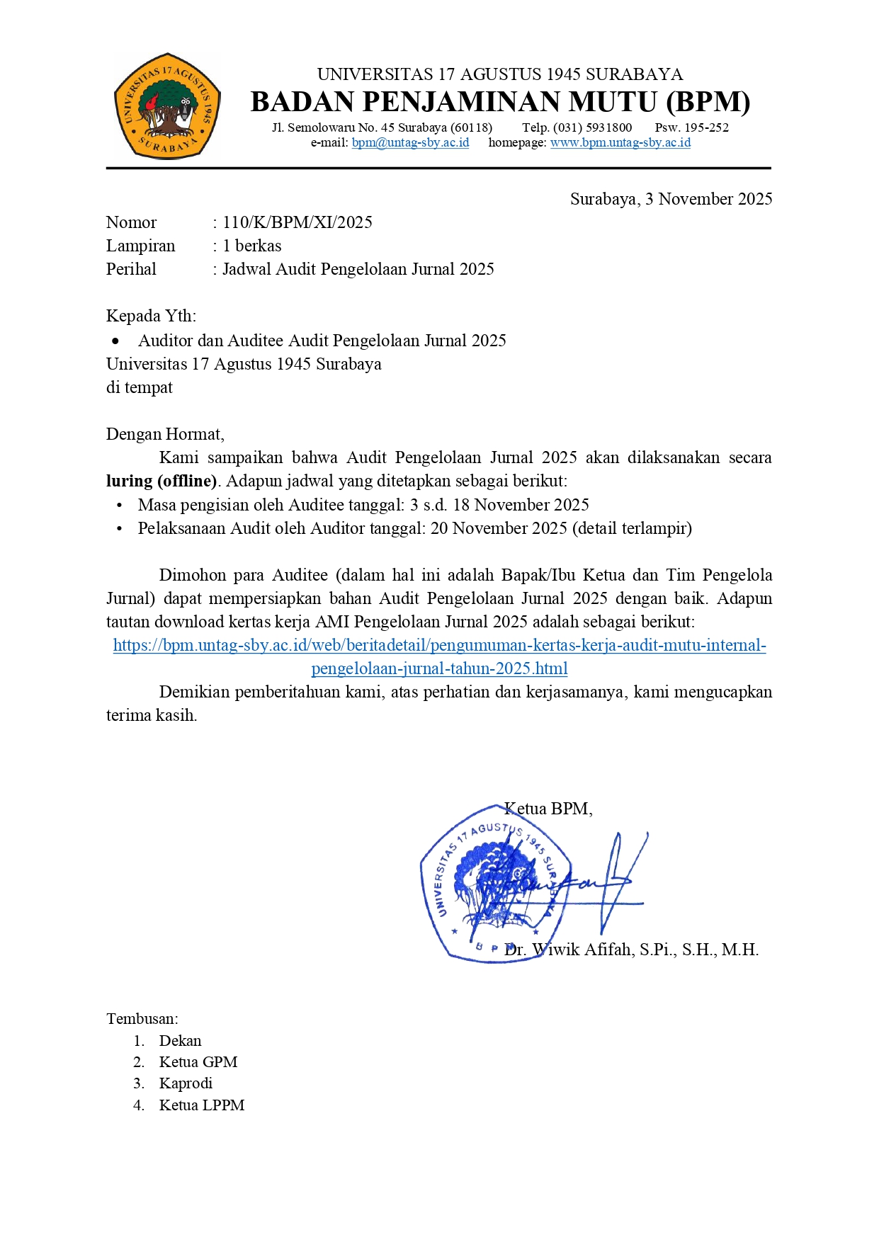 Kegiatan audit ini bertujuan untuk menilai tingkat kesesuaian pengelolaan jurnal ilmiah di lingkungan universitas terhadap standar mutu yang telah ditetapkan oleh UNTAG Surabaya serta panduan nasional pengelolaan jurnal ilmiah.