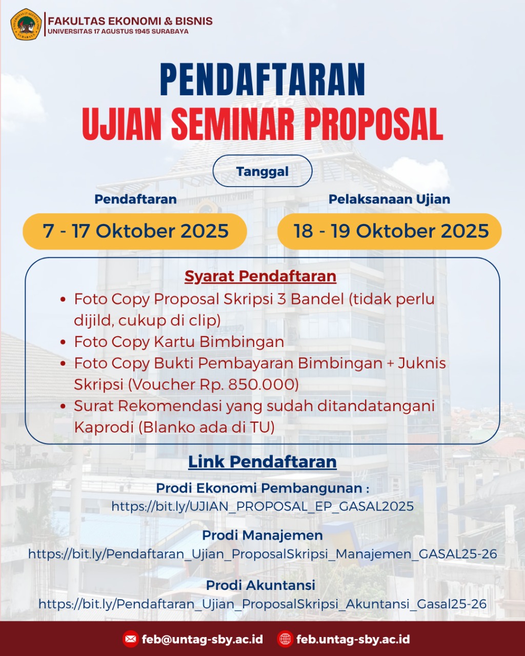 Fakultas Ekonomi & Bisnis Universitas 17 Agustus 1945 (UNTAG) Surabaya membuka pendaftaran Ujian Seminar Proposal bagi mahasiswa Program Studi Ekonomi Pembangunan, Manajemen, dan Akuntansi.