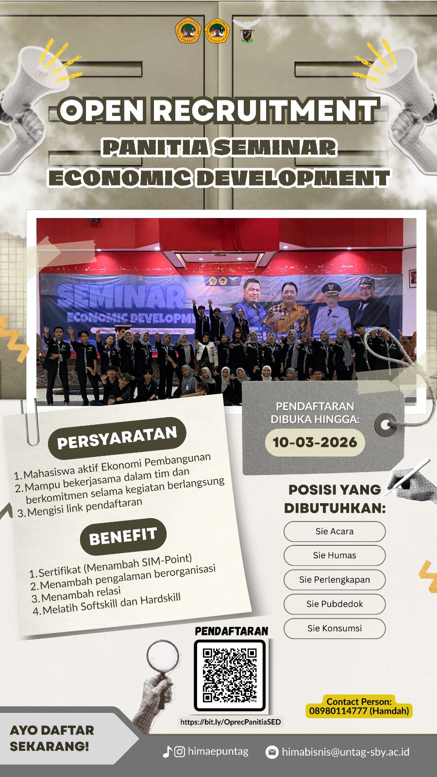Bagi kamu yang ingin menantang diri sendiri dan siap menjadi bagian dari tim hebat di balik terselenggaranya Seminar Economic Development, inilah saatnya! ?