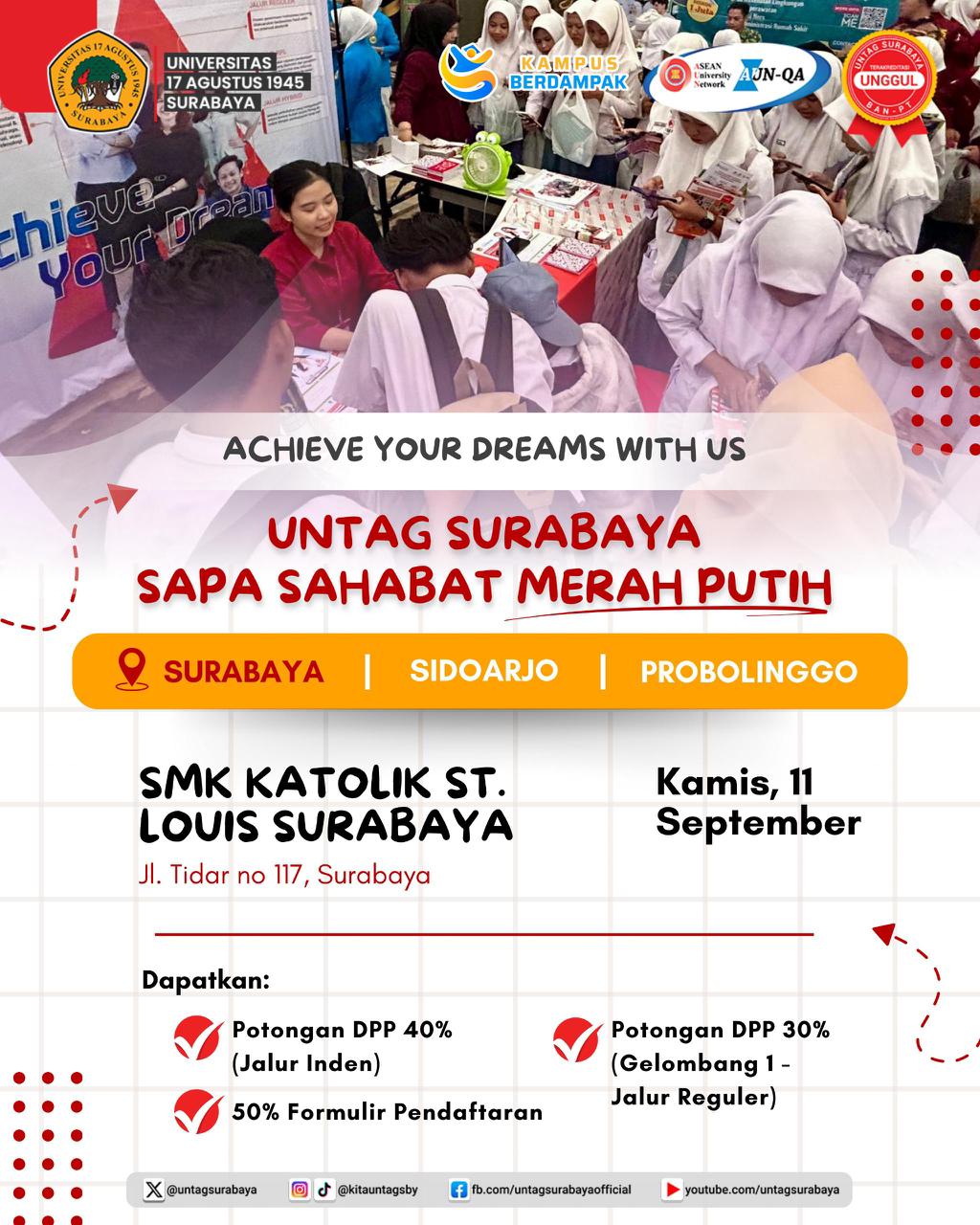 Dengan mengusung slogan “Achieve Your Dreams with Us”, UNTAG Surabaya terus berkomitmen menghadirkan pendidikan berkualitas, membentuk generasi unggul, berdaya saing global, dan berkarakter kebangsaan.